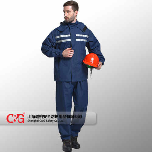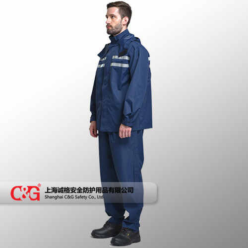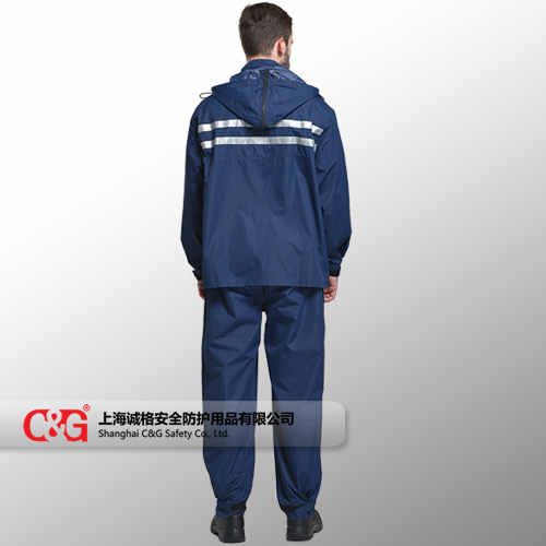 材質為防水涂層面料,接縫壓膠,可防大雨; 帽沿、袖口、褲腿有可調節魔術貼,有效防止雨水進入; 前胸、后背高亮反光條,增加可視性。