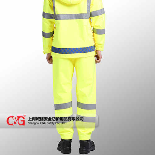 材料:100%滌綸牛津防水PU涂層織物 特點:5cm反光帶 用膠帶縫好以防大雨 可拆卸風帽