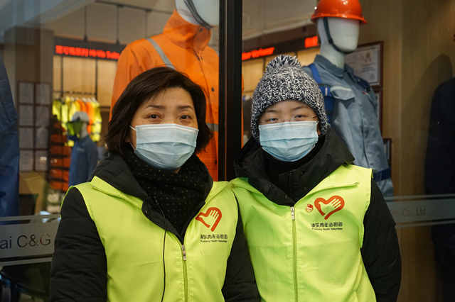 楊高虹和胡晨芳是一對母女,女兒是95后,媽媽是75后。她們早上8點半就到崗了,戴口罩、量體溫、登記、核查身份,全部通過后才能上崗。