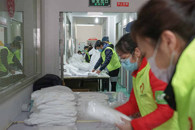 志愿者的工作為輔助性質,為配合一線技術工人的工作時長,志愿者服務時間分為白班和夜班。白班為早上8點至晚上9點,夜班為晚上9點至凌晨5點。每個班次至少20人,并適時根據生產要求增加。長時間、高強度的班次安排,對專業的技術工人來說壓力都不小,對志愿者的挑戰就更大。志愿者嚴帥說:“我們技術工作做不了,但疊衣服和裝箱,都能干!”長時間站立、埋頭工作非常辛苦,但很多志愿者都舍不得輪換休息,從頭到尾不停地在工作。