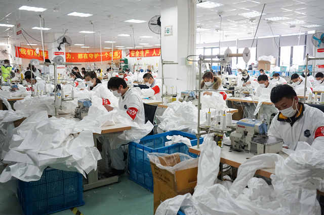 “我去年剛入了黨,看到這么多醫護人員奮戰在抗疫線,很感動,所以就想為他們做些什么,用實際行動向他們致敬。”一件防護服的流程大致是:裁原料,縫紉,剪線頭,檢驗,貼商標,包裝,清點,裝箱。當志愿者的天,顧祥舜分配到的工作就是給防護服“剪線頭”。