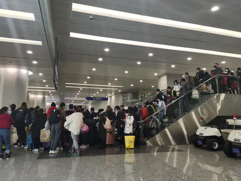 下午2時(shí)30分,記者看到,俄航某進(jìn)境航班旅客正在國(guó)際到達(dá)區(qū)域進(jìn)行健康申報(bào)、測(cè)溫等工作。旅客們從下飛機(jī)到完成各個(gè)排查流程,可能需要數(shù)個(gè)小時(shí)。而后續(xù)航班即便已經(jīng)抵達(dá),旅客或許也暫時(shí)無法下機(jī),他們要等到前道航班完成所有檢疫排查之后才能開啟進(jìn)境申報(bào)流程。記者看到,雖然旅客等候的時(shí)間很長(zhǎng),但他們多非常配合,而衛(wèi)生檢疫一線的海關(guān)關(guān)員面對(duì)長(zhǎng)長(zhǎng)的隊(duì)伍以及后續(xù)可能要排查到半夜的航班,其嚴(yán)防嚴(yán)控力度絲毫不松。非常時(shí)期,安全與便利,不應(yīng)有所調(diào)和。