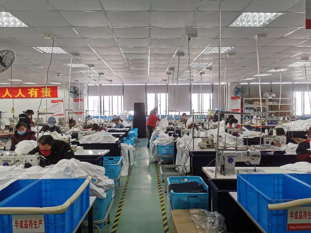 最終走訪了3家企業,才將15臺拷邊機湊齊。當晚,周浦鎮產業園連夜把機器運回誠格工廠。深夜3點,廠房消毒完畢,設備組裝調試維修完畢,打樣確認準備生產完畢。